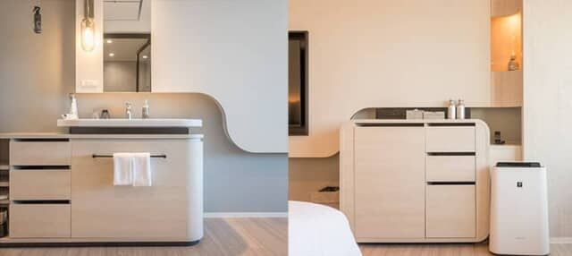 壁がアールを描いていたり、キャビネットやしつらえも曲線で構成される優しいデザイン。洗面スペースの照明も船を思わせる円筒形で、旅へのワクワク感をかき立てられます。