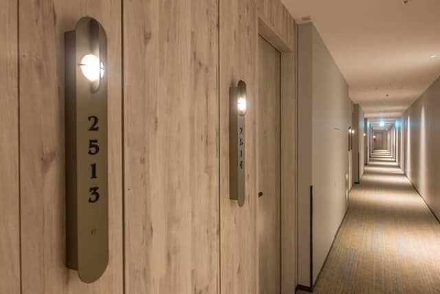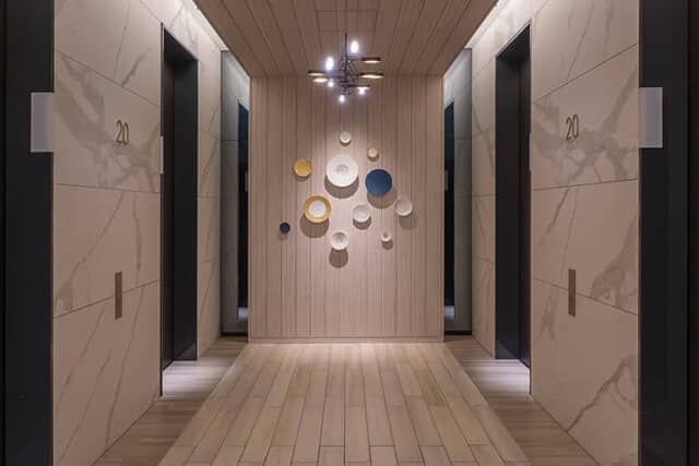 船舶デッキ(ロビー階)とキャビン(客室階)を結ぶエレベーターホール。ここの床もフローリングを採用していて、正面に飾られたアートは、ホテルのプール、海、水の波紋、夜景、光の輝きをイメージしています。