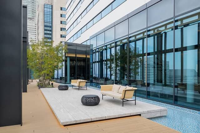 水が張られ、リゾートソファが置かれたテラスからは、みなとみらいの景色を一望。港町の風も心地よく、フォトスポットとしてもゲストに人気です。