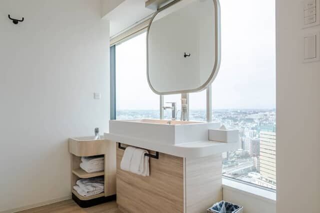 洗面を使うという日常と、窓に広がる非日常の風景が同居するスペースです。