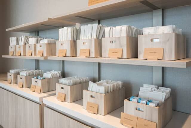 一部の客室を除き、歯ブラシなどのアメニティーは客室に置かれていないので、必要なものはレセプションの横にあるアメニティーバーからピックアップします。