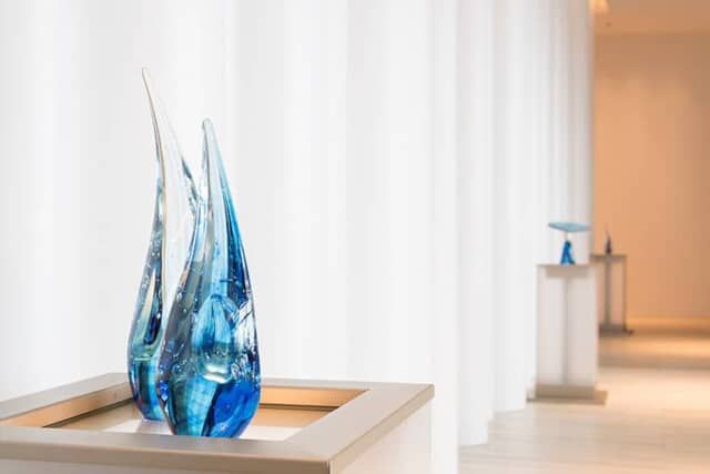 青い吹きガラスで作られた作品は、海のうねりや海風を表現しています。