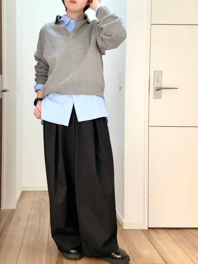 スタイリングにアクセントをプラスしてくれる襟とスキッパーがスッキリとしたシルエットに見せてくれるので、計算せずとも女らしさを醸せるのが1番の魅力。スウェットとニットのいいとこどりをしたようなやわらかな着心地かつ綿100%なので毛玉にならないのも嬉しいポイントです。1枚ではもちろん、レイヤードした着こなしも愉しめて、幅広い着回しができます。