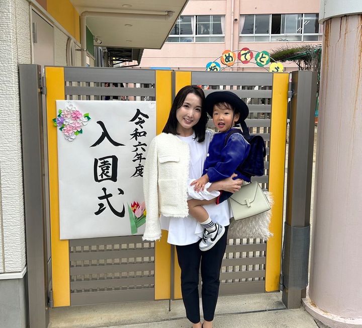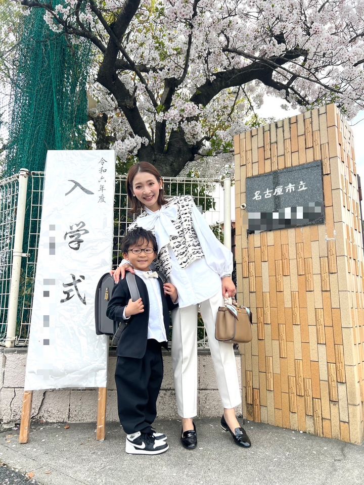 「入園式は明るい色のイメージだったので最初はパンツも白にする予定でしたが、雨だったのもあり泣く泣くネイビーに変更。とはいえ式の間は座っていてパンツは見えないので、上半身を白にしておけば暗くはなりませんでした」山上里菜さん/34歳・歯科衛生士(4歳の男の子ママ)