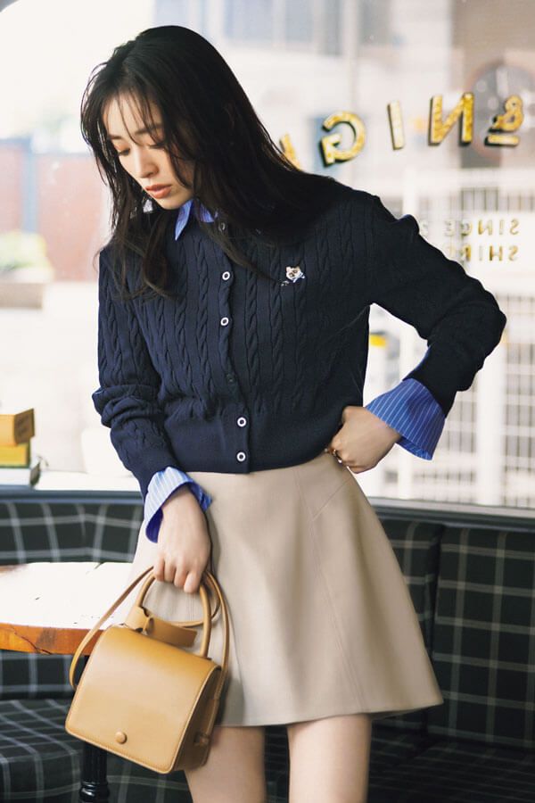 大人のミニコーデの相棒に最適!「ケーブルカーデ×シャツ」なら品格あるムード満点♪