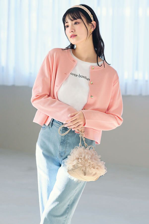 バッグ[18×21×11㎝]¥6,490/カシュカシュ(アンビリオン) カーディガン¥5,489/ロペピクニック Tシャツ¥2,980/アテニア パンツ¥9,990/UNFILO(オンワード樫山) カチューシャ¥4,950/CELFORD イヤリング¥6,600/ポピー・ケー(ロードス)