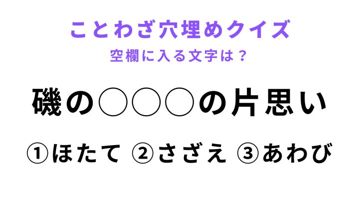 「磯の〇〇〇の片思い」の空欄に文字を入れると、あることわざが完成します。