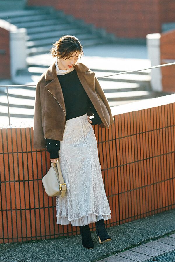 ブラウンのボアと白レースのカフェラテトーンでフレッシュに。黒を混ぜて引き締めつつ、白タートルで洗練された雰囲気もよくばって。