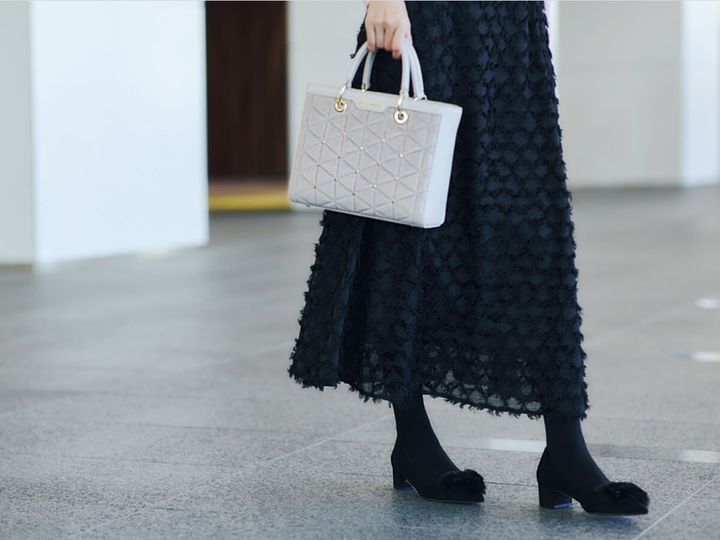黒スカート&白バッグでピンクの糖度をセーブ。