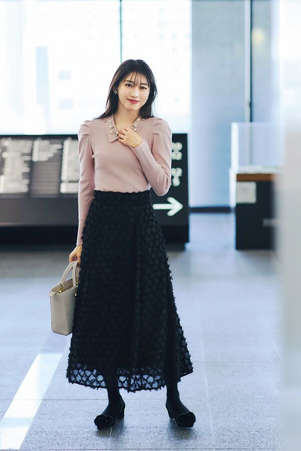 えり付きパフスリーブニットは大粒パール付きで上品さと華やかさを両立できる優秀アイテム。黒のジャカードスカートでピンクの糖度をほどよくおさえてバランス調整を。