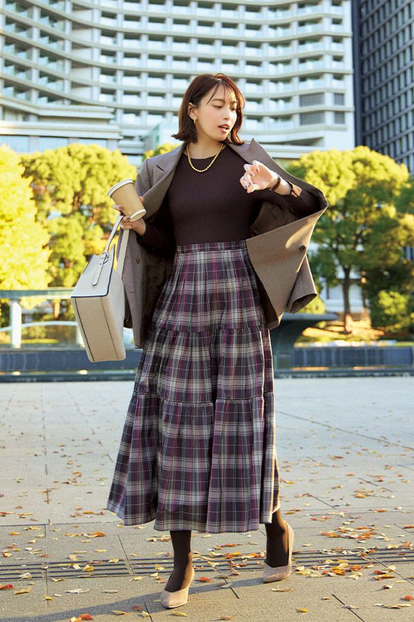 ニット×プリントスカートをコーディネートしたような高感度なルックスが魅力のドッキングワンピで時短おしゃれ♪ テーラードジャケットをレイヤードしてきちんと感をプラスすればお仕事仕様に。ブラウン&ベージュのワントーンで大人っぽくこなれて。