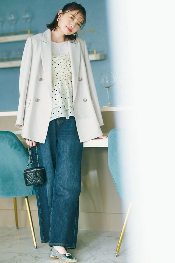 きちんとしているのに堅苦しく見えない。ゆるっとシルエット&淡色で着こなし幅が拡大したジャケットは、今まで以上にシーンレスで頼れる! インコーデにビスチェをレイヤードして、ジャケットスタイルに新鮮味をプラス♡ ワイドなデニムで着崩してほどよい抜け感に。