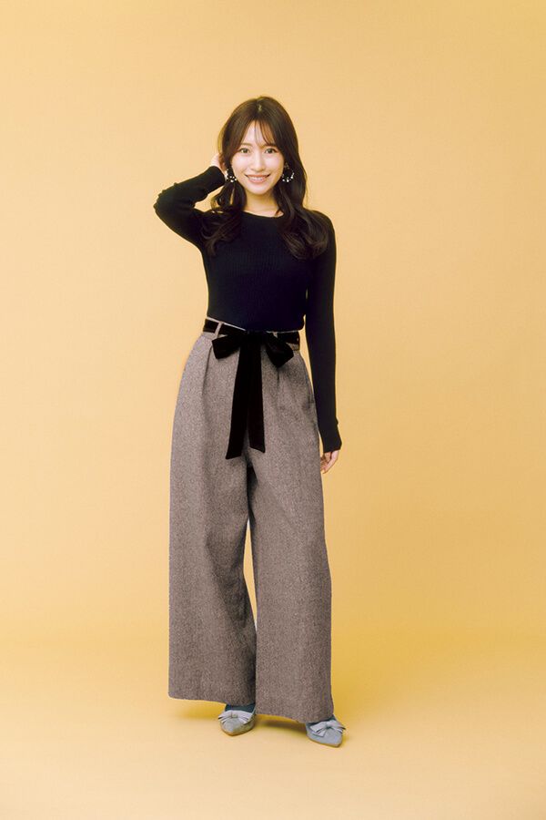 下重心になりやすいワイドシルエットもビッグリボンで目線を上げて。