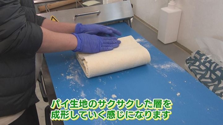 田口 郷さん:「バターと生地を畳んで、さらに伸ばすっていう工程を何度か繰り返して、パイ生地のサクサクした層を成形していくっていう感じになります」