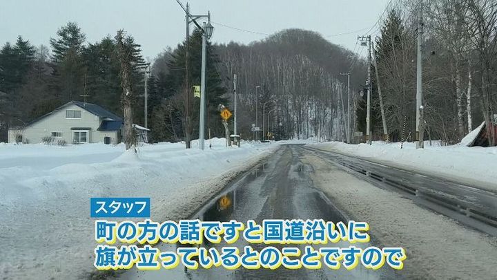 スタッフ:「金山の中心部をスタートします。町の方の話ですと、国道沿いに旗が立っているとのことですので、その旗を探してみたいと思います」