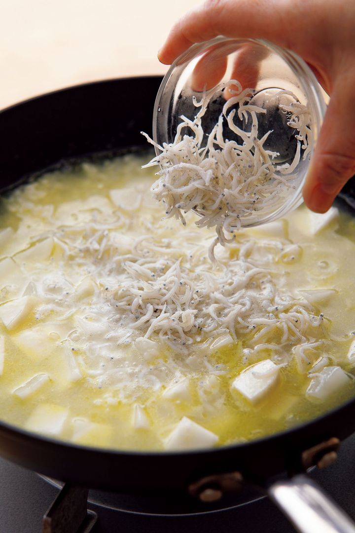 (3)しらす、水を加えてさらに煮る