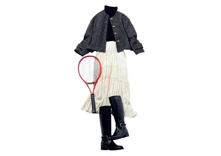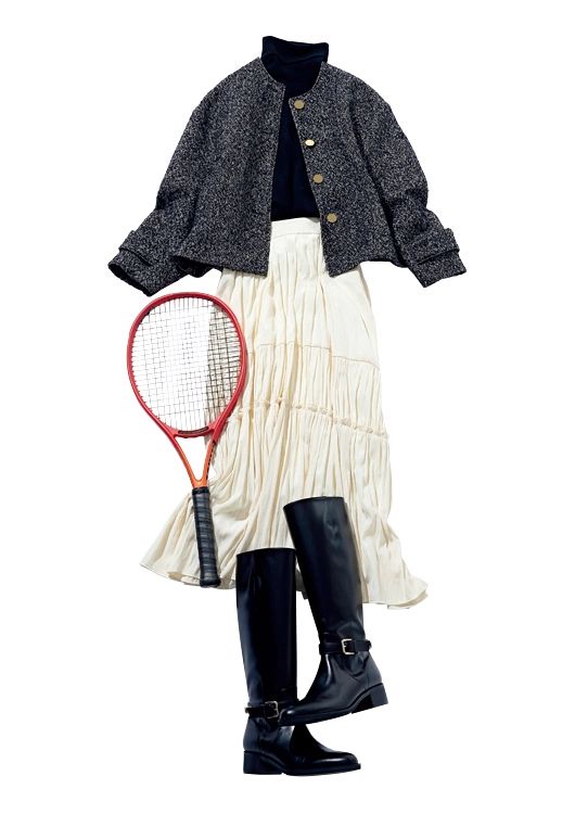 ツイードセットアップ(ジャケット)¥44,000/アルページュストーリー タートルニット[一部店舗のみで販売]¥9,990/UNIQLO ブラウス×スカートセットアップ(スカート)¥24,200/ジル スチュアート ロングブーツ¥39,600/ダイアナ(ダイアナ 銀座本店) ラケット¥38,500/プリンス(グローブライド)
