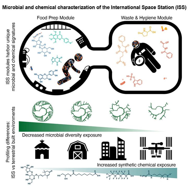ISSでは強力な消毒剤の化学物質が多く検出されており、その影響で環境中の微生物が大幅に減少していると推定された