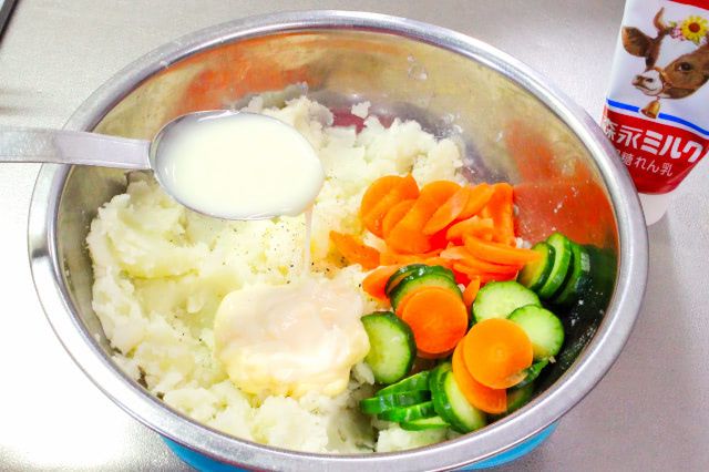 4. ボウルに3を入れて潰し、きゅうり、にんじん、塩(1つまみ)、黒こしょう、練乳、マヨネーズを加えて、混ぜ合わせます。