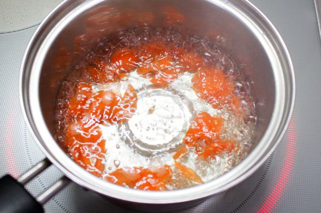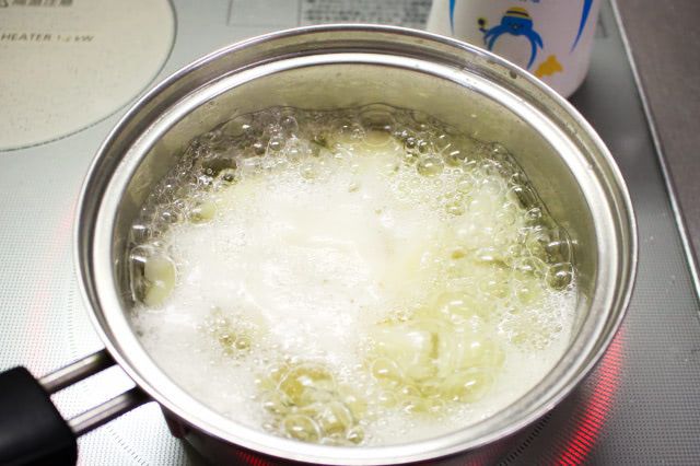 8分ほど茹でると、じゃがいもがやわらかくなりました。じゃがいもは大きさによって火の通りが違うので、竹串を刺して火の通りを確認してくださいね。