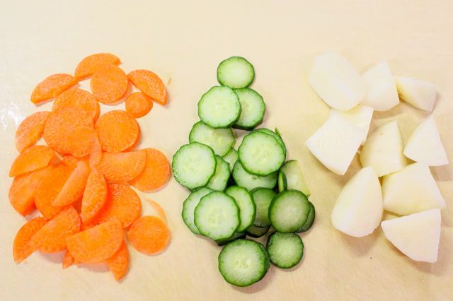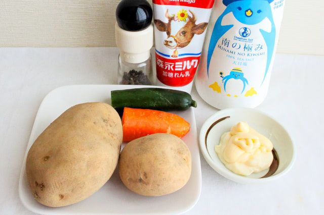 1. じゃがいもは皮を剥き、ひと口サイズにカット。きゅうりは小口切り、にんじんはいちょう切りにします。