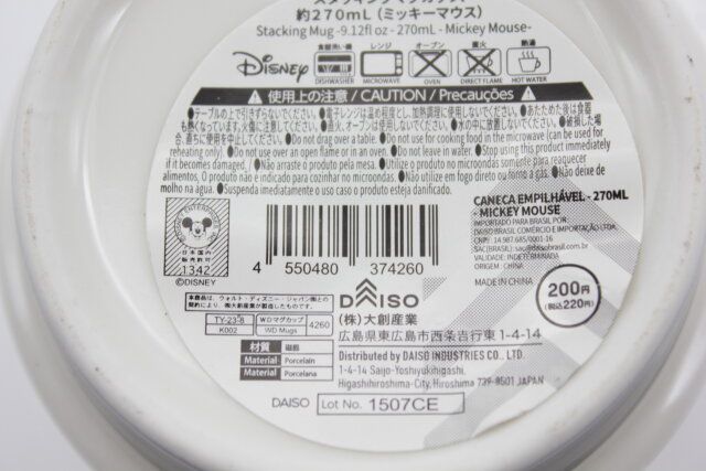今回は、ダイソーの『スタッキングマグカップ、約270mL(ミッキーマウス)』をご紹介しました。