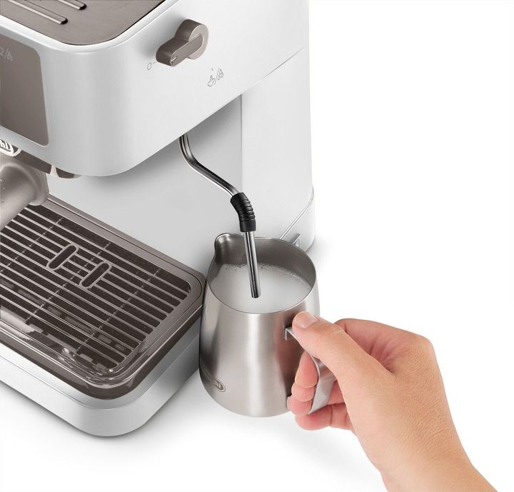 その同シリーズに新たに登場する新色は、インテリアになじみやすいホワイト。グレージュの色合いが温かみとクールさ併せ持つエスプレッソ・カプチーノメーカーは、自宅をおしゃれなカフェに演出してくれる。ミルクフロッサーを使用して、クリーミーなカフェラテからふわふわ泡のカプチーノなどのミルクメニューに加え、手軽にラテアートが楽しめるのも魅力だ。