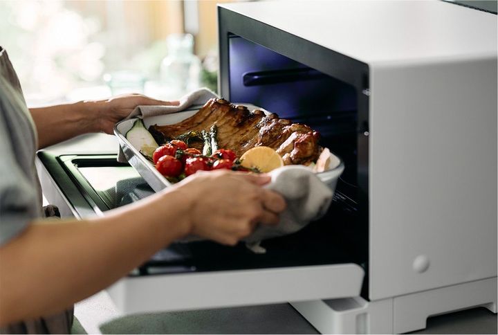 食材の温度をダイレクトにセンシングし、均一で高精細なあたためを実現した「レンジ」機能。最大250℃まで上がり、1.2kgの塊肉でもムラなく火を通せる「オーブン」機能。高火力なヒーターの力で、プロ並みの料理を叶える「グリル」機能が選べ、あらゆる調理をカバー。キッチン空間を美しく進化させる、ビルトインオーブンレンジのようなシームレスな佇まいや、直感的な使い心地を極めたデザインも強みだ。カラーはホワイトとブラックの2色展開となる。