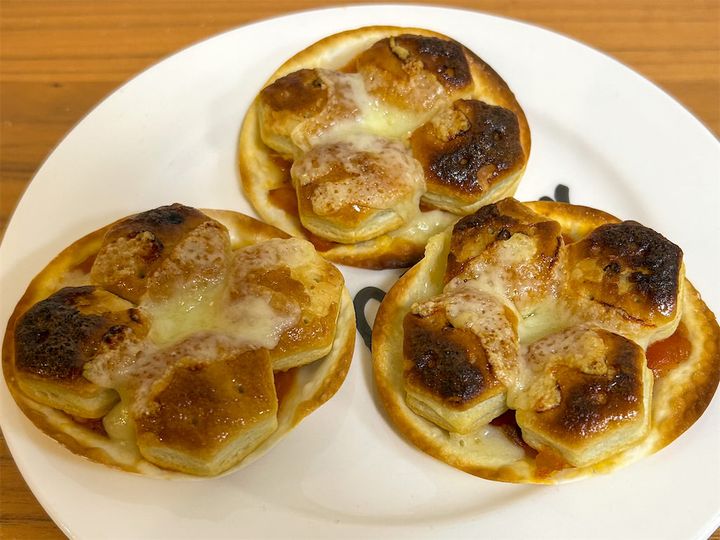 6.わあ!おいしそうなピザが焼き上がりました!チーズが溶けて、餃子の皮の周りが薄茶色になったらOKです。