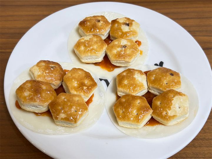 餃子の皮はいろいろなサイズのものが売られていますが、直径8cmのものを使うと、パイの実がピッタリ収まりました。