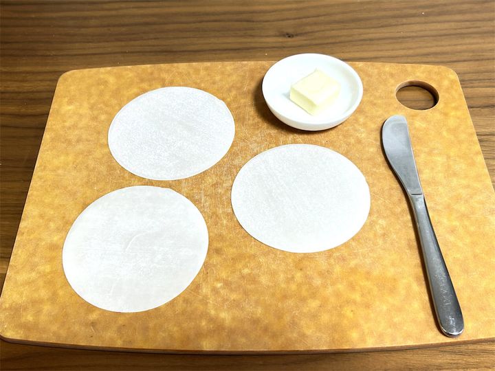 バターを均一に薄く伸ばすのが結構難しい…。餃子の皮を破かないように、慎重に塗っていきます。
