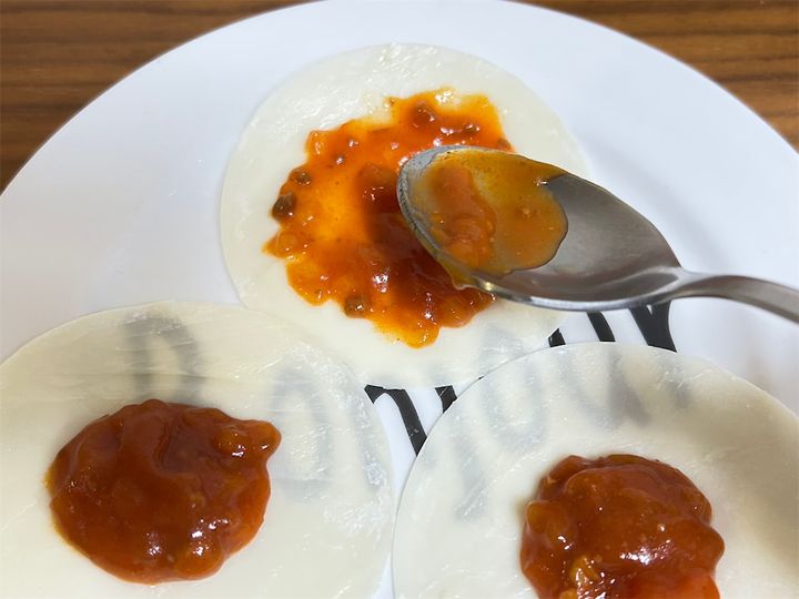 2.1の餃子の皮に、ミートソースを重ねて塗ります。