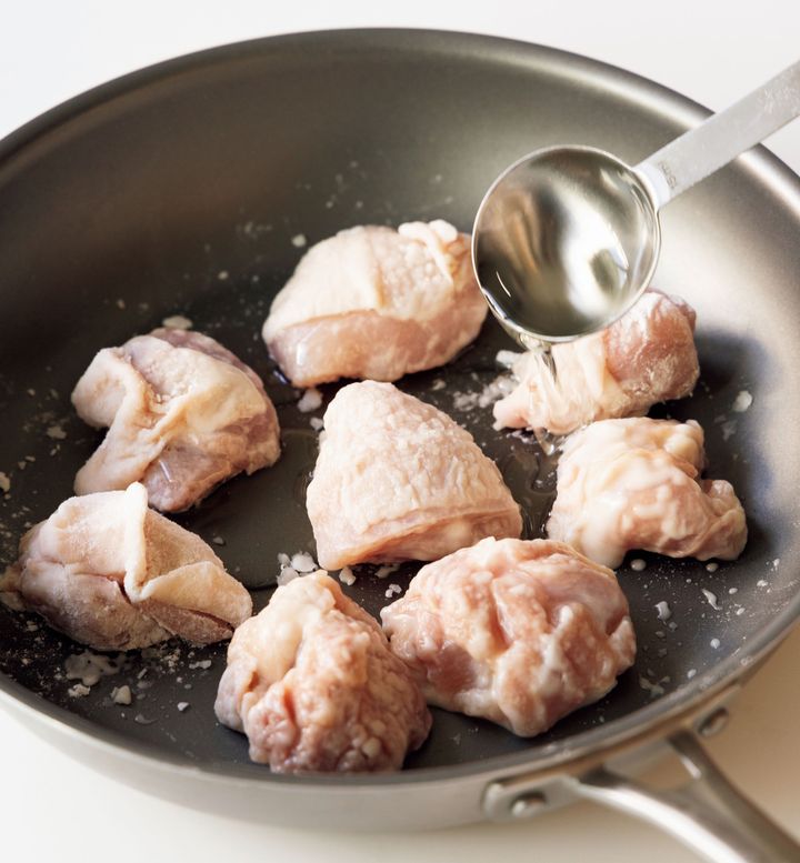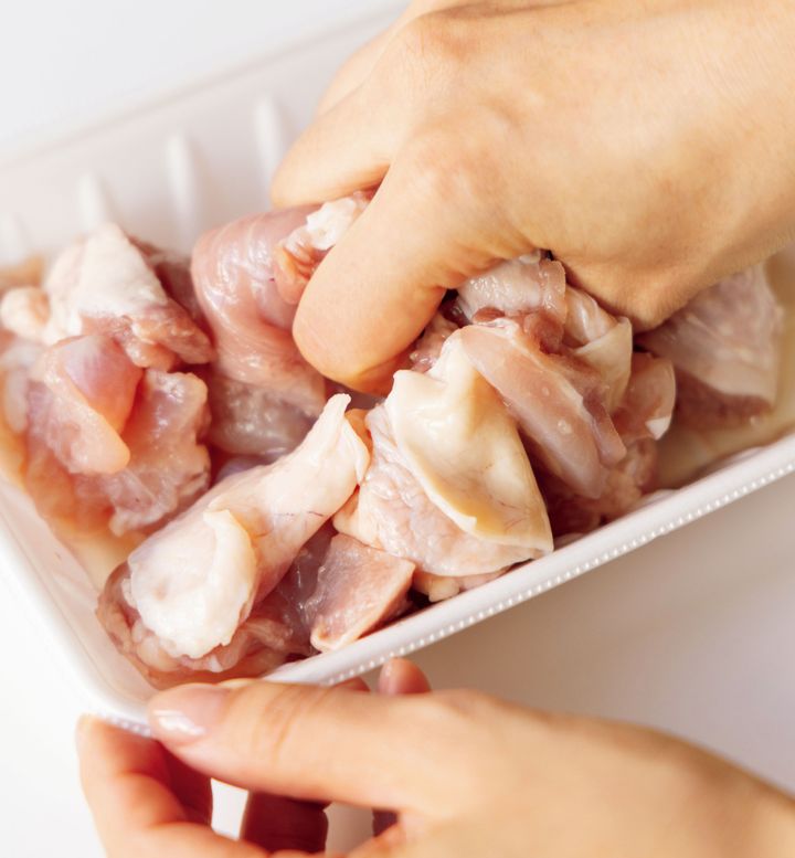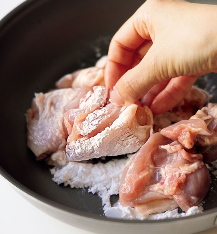 肉に片栗粉をつけるときは、すべて肉で拭き取るくらい、くまなくつけて。肉のカリカリ感がアップします!