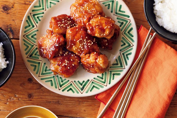 鶏肉を端に寄せ、フライパンのあいたところに〈ヤンニョムだれ〉の材料を加えて、かるく混ぜる。中火にかけ、肉にたれをからめながら混ぜる。全体がなじんだら器に盛り、好みで白ごまをふる。