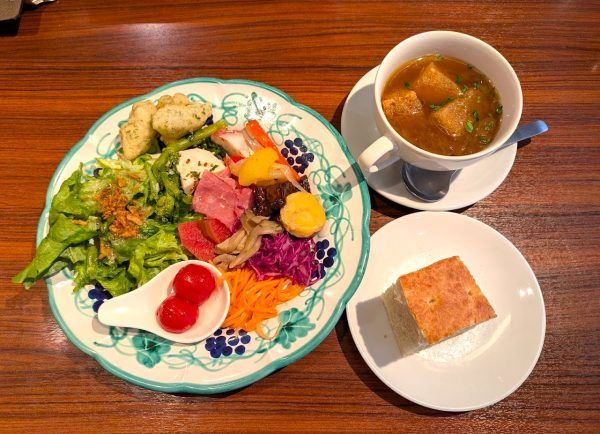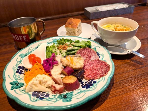 アンティパストランチ(オニオンスープ) 1000円 メインの10種の前菜盛りに、オニオンスープとフォカッチャ付きです。