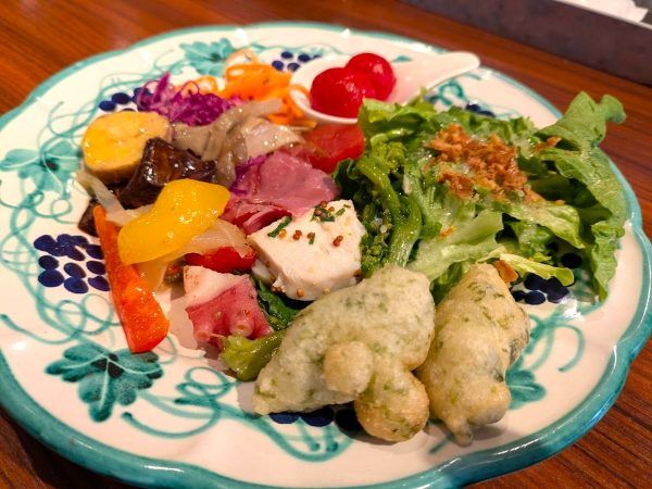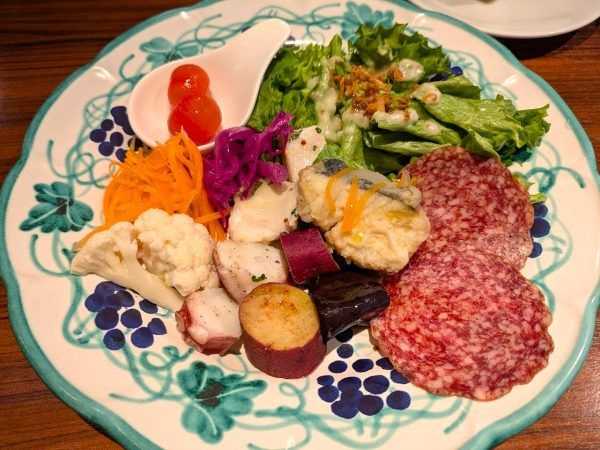 アンティパストが盛りだくさんです。色鮮やかな前菜盛りとイタリアのお皿ですね。さつま芋にキャロットラペ、根菜の温野菜に葉野菜のサラダ。カリフラワーにタコのマリネ、大きな霜降りのミラノサラミ!お皿は水彩画のように美しい発色のマヨリカ焼きですね。綺麗です。