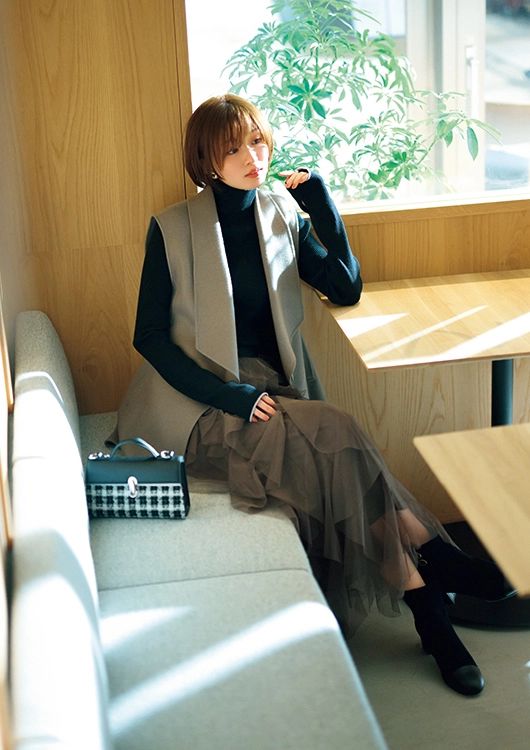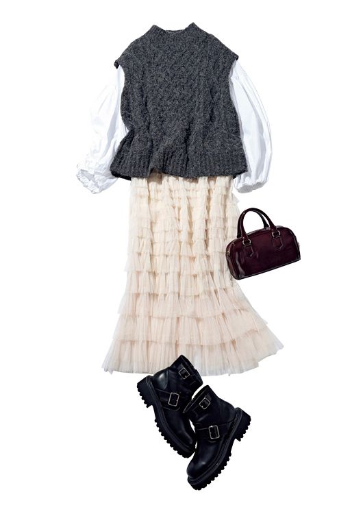 チュールスカート¥12,100/31 Sons de mode(ヒロタ) ジレ¥31,900/マイストラーダ ニット¥3,490/FOREVER21(アダストリア) イヤリング¥2,420/mimi33(サンポークリエイト) リング¥53,900/アナプノエ(フォーティーン ショールーム) バッグ¥14,300、ブーツ¥30,800/ともにダイアナ(ダイアナ 銀座本店)