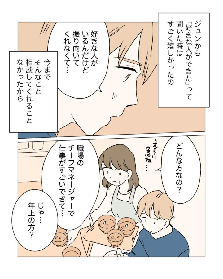 「ジュンから『好きな人ができた』って聞いた時はすごく嬉しかったの。今までそんなこと相談してくれることなかったから」と、ジュンとの結婚を迷う私にお母さんは静かに話し始めました。