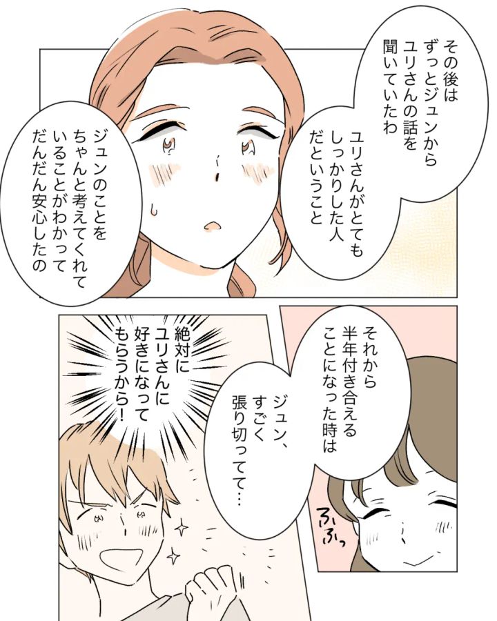 私の年齢を聞いて最初は驚いたこと、「『恋愛対象として見れない』と言われたけど諦めきれない」と聞いて戸惑いながらも「頑張らなくちゃね」と伝えたことなど、お母さんは私がジュンと付き合う前のことから色々と話してくれました。