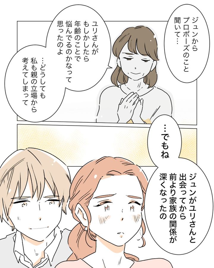そして、「ジュンからプロポーズのことを聞いて・・ユリさんがもしかしたら年齢のことで悩んでるのかなって思ったのよ。・・どうしても私も親の立場から考えてしまって」と、複雑な思いがあったことを打ち明けてくれたお母さんは「・・でもね」と続け、「ジュンがユリさんと出会ってから、前より家族の関係が深くなったの」と嬉しそうに話してくれました。