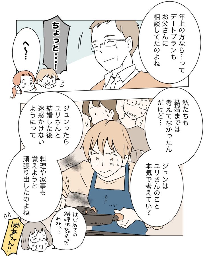 交際が始まってからもジュンは私のことをよく家族に話していたそうで、「年上の方なら・・ってデートプランもお父さんに相談してたのよね」とお母さんが話すとジュンは「ちょっと・・!」と恥ずかしそうにしていました。そして、ジュンが私との結婚を本気で考えていること、結婚後のことを考えて料理や家事も覚えようと頑張っていたことを教えてくれました。