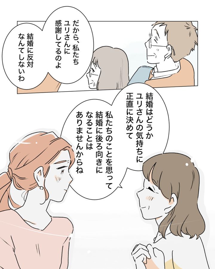「だから、私たちユリさんに感謝してるのよ。結婚に反対なんてしないわ」と言うお母さんの言葉に、お父さんもおばあちゃんも「うんうん」と笑顔で頷きます。「結婚はどうかユリさんの気持ちに正直に決めて。私たちのことを思って結婚に後ろ向きになることはありませんからね」優しい笑顔でお母さんにそう言ってもらえ、私はジュンとの結婚を前向きに考えられるようになれたのです。