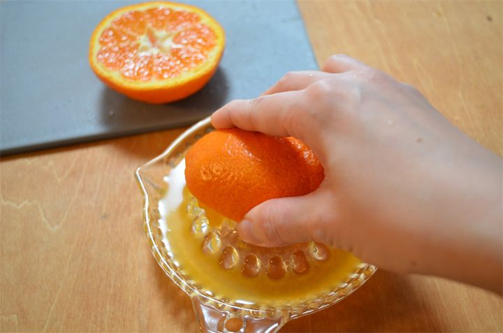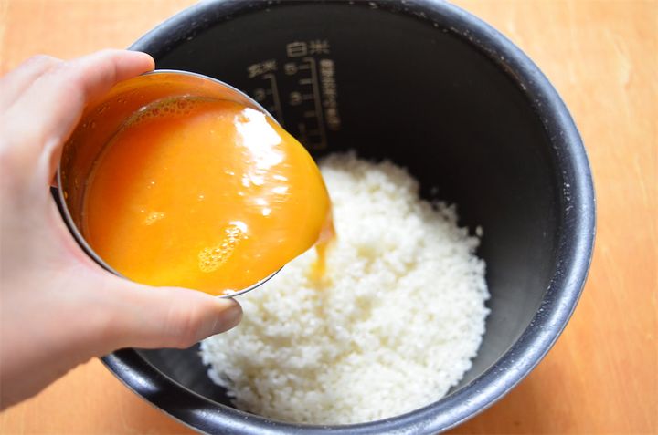 3.みかんは果汁を搾って100ml取り分ける。炊飯器に1の米と果汁を入れたら、水(分量外)を炊飯器の2合目の目盛りまで入れ、通常炊飯する。