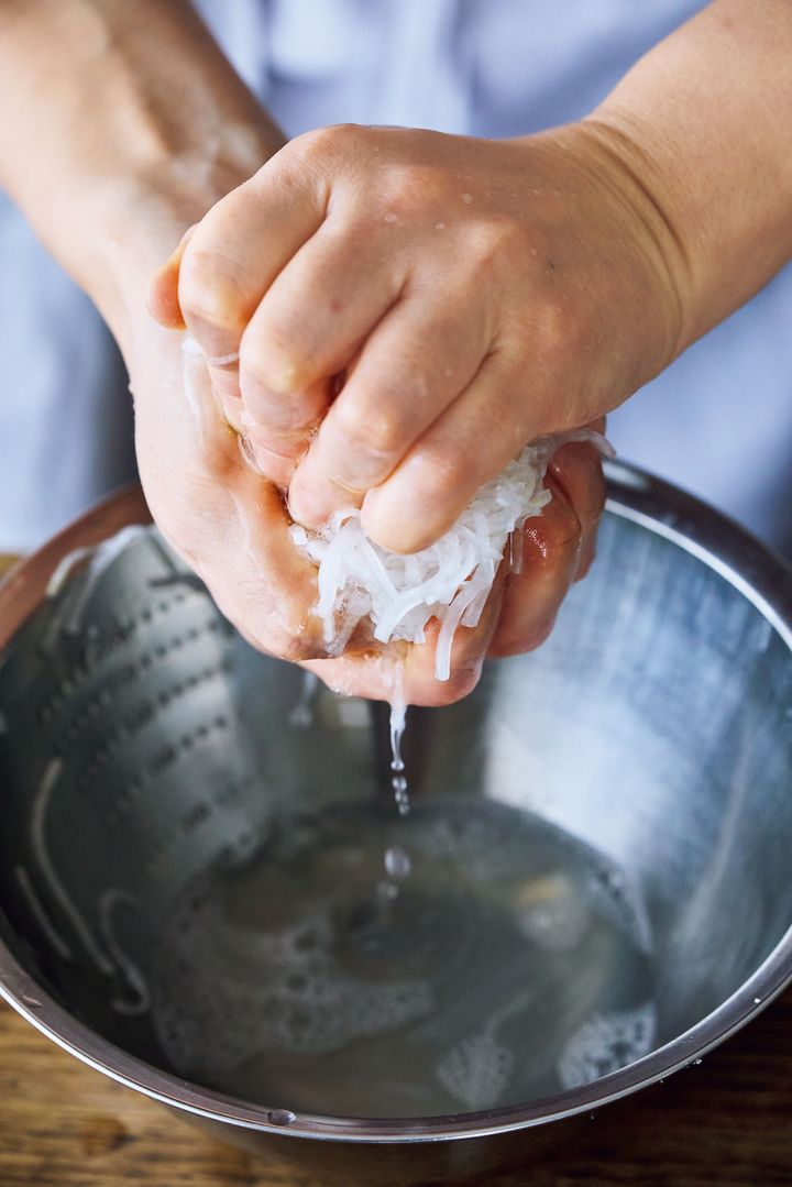 緑豆のでんぷんが原料の「緑豆春雨」でも作れますが、おすすめはじゃがいもやさつまいものでんぷんを使った、国産の春雨。太くて食感もちもち!