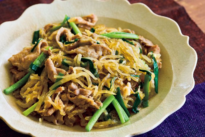 フライパンにサラダ油大さじ1を中火で熱し、豚肉を広げ入れてさっと炒める。(1)を加えて1分ほど炒め、煮汁と、水けをきった春雨を加えて、汁けがほぼなくなるまで混ぜながら3分ほど煮る。万能ねぎとごま油大さじ1/2を加えてひと混ぜする。