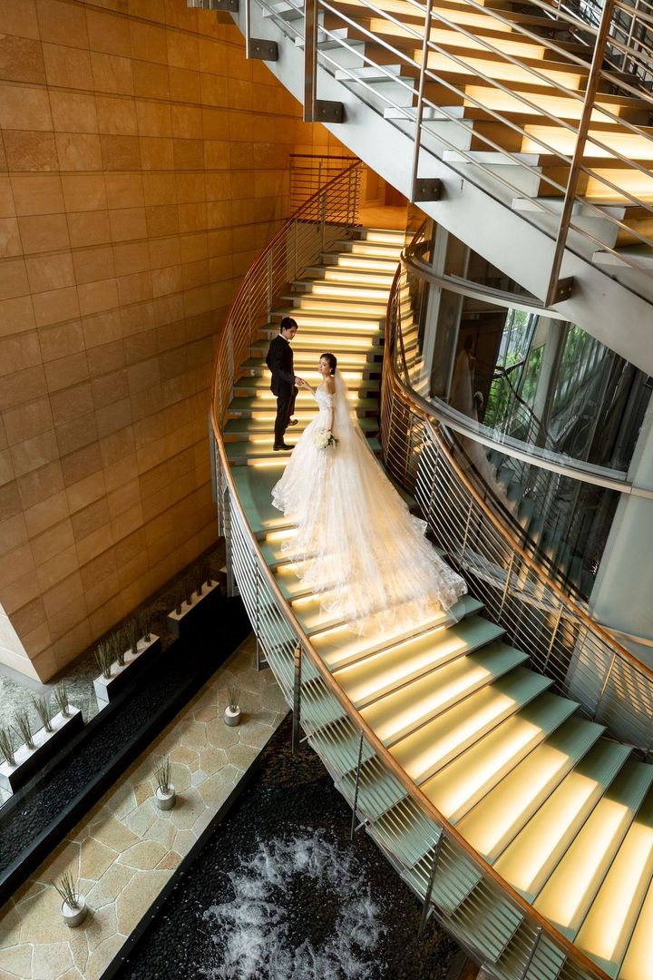 1階から4階まで吹き抜けになったロビーエリアには、モダンなデザインの階段がしつらえられています。ライトアップしているので、ドレスのトレーンが光に透けてとてもきれい。上からの撮影も素敵ですが、下から見上げるような構図も人気です。