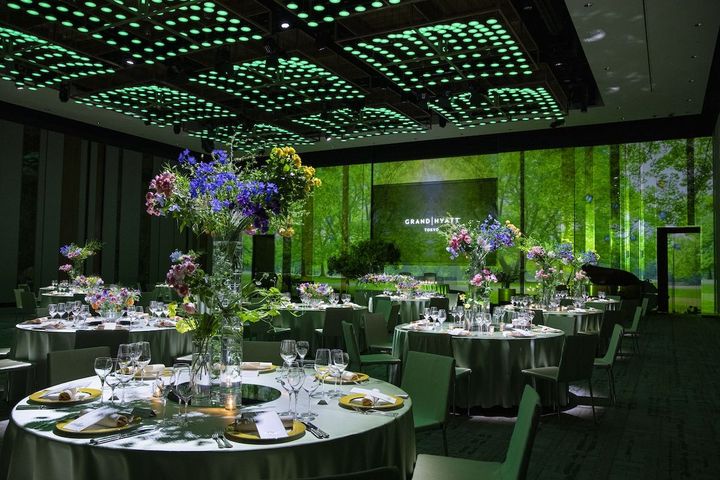 「グランド ボールルーム」は自在に色を変えられるLED照明とプロジェクションマッピングを取り入れてテーマに合わせた演出が可能。写真はグリーンのライトと映像で、さながら森の中のパーティのようなコーディネート!