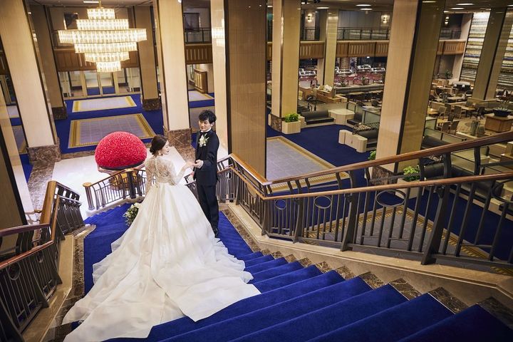 エントランスに入ると目の前に広がる、重厚感あふれる階段。クラシックモダンなシャンデリア、ロイヤルブルーのカーペットに白いドレスが一段と映えます。ホテルを代表する場所での撮影は、ウエディングの大切な思い出になるはず。