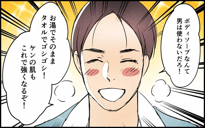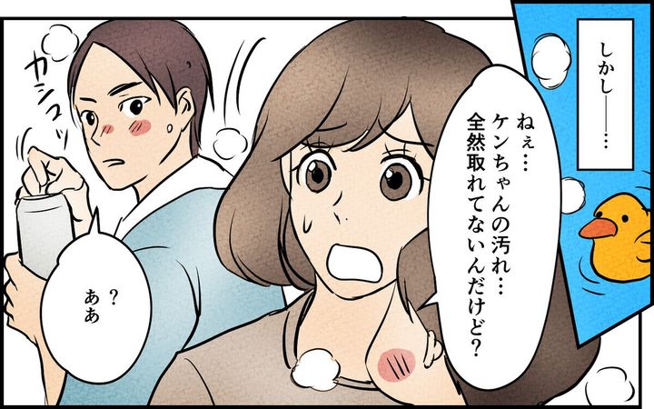 妻は夫にお風呂に入ってもらおうと作戦を練ります。息子と一緒なら…と考えた作戦は成功。しかし、息子の汚れが全く取れていなくて…。夫に聞くと「男はボディーソープなんて使わない」と言い出します。夫のこの考えのままでは良くない「ちゃんと話さないと」と思うのですが…。