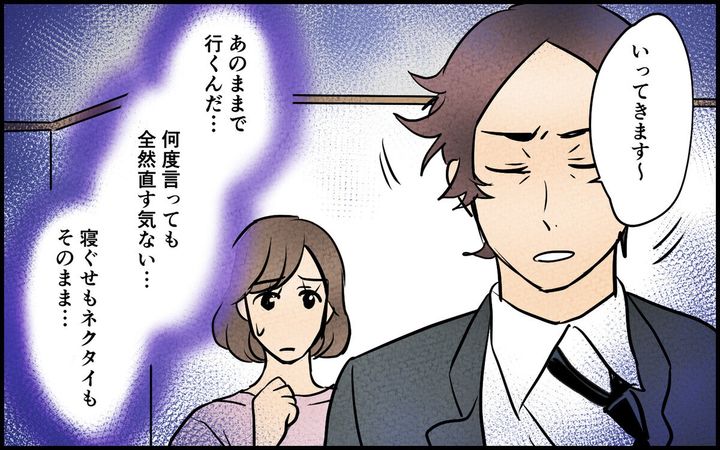 妻が言わないと、お風呂に入らない夫。そのまま寝ようとする夫に妻が汚いまま寝てほしくないと頼みます。夫は洋服は脱いでもお風呂は入らず、そのまま寝てしまいました。髪は乱れたまま、ネクタイも曲がってままで出社したのでした…。